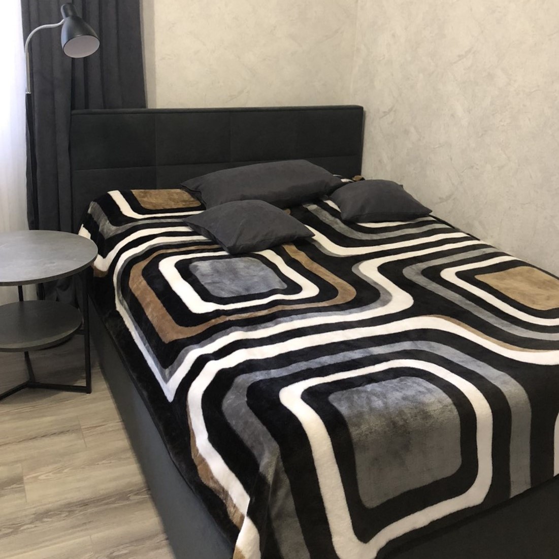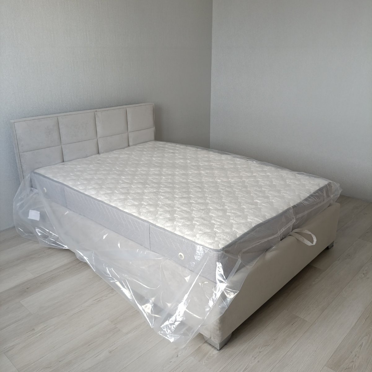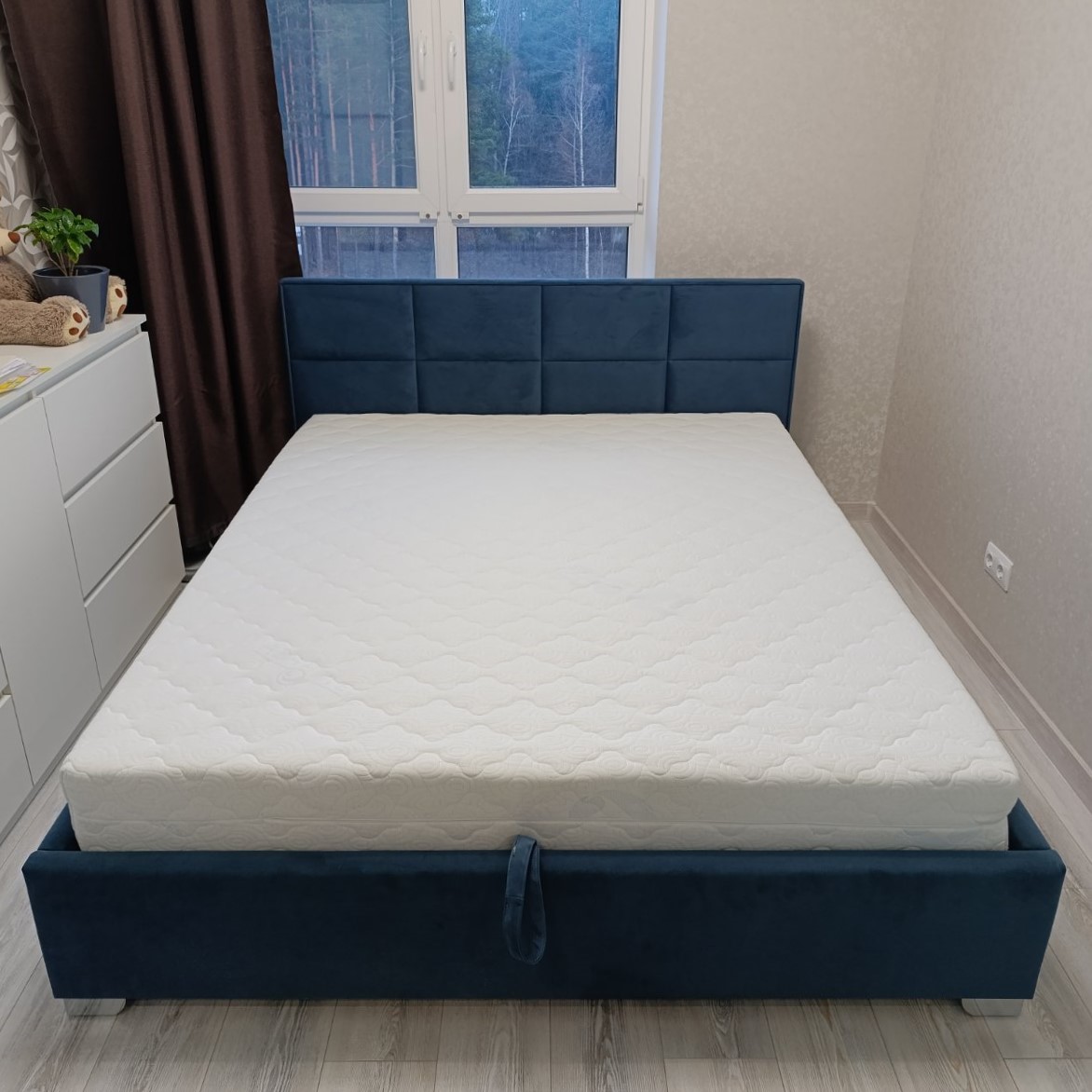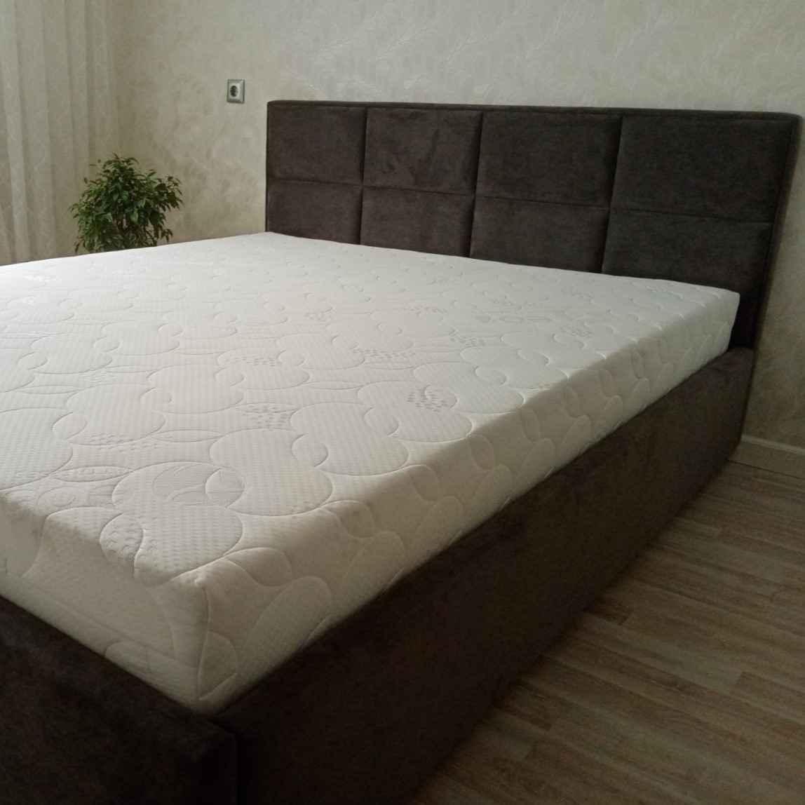 Вариант обивки и цвет, выбрала на сайте, все обговорила с менеджером. Обивка очень приятная тактильно, смотрится дорого, комфортна в обиходе. Спальное место просторное. Лаконичный дизайн вписывается в современную спальню. Пользуюсь коробом, удобно.