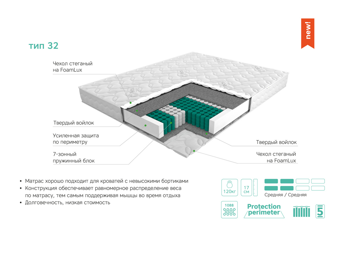 Усиленная защита по периметру из современного, эластичного, гипоаллергенного материала FoamLux удерживает пружинный блок, предотвращает проседание и потерю формы.