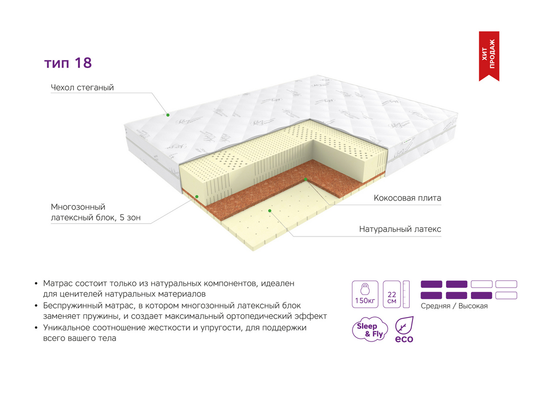 Матрас EOS Элит 18 – состоит только из натуральных компонентов. Это беспружинный матрас, в котором многозональный латексный блок заменяет пружины и создает максимальный ортопедический эффект.