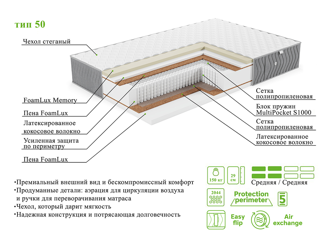 Матрас выполнен на основе пружинного блока премиум класса с настилочными слоями увеличенной высоты. Это делает модель выше (высота — 29 сантиметров!) и надежнее (нагрузка на спальное место до 150кг). Аэраторы по периметру матраса создают циркуляцию воздуха внутри и увеличивают его срок службы. Пружинный блок и пена с эффектом памяти моментально подстраиваются под положение тела, а дополнительный эффект невесомости создаёт пышная стежка чехла.