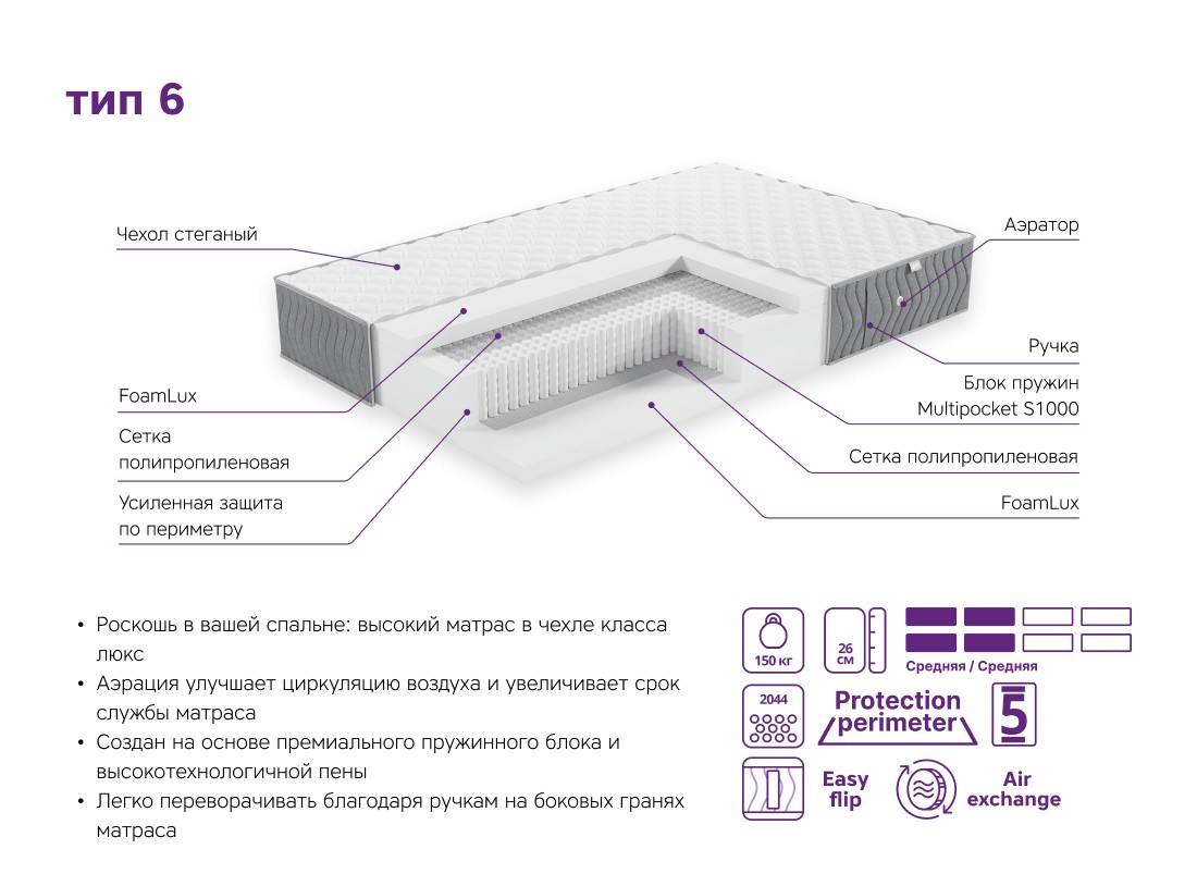 В создании коллекции «Элит» использованы только высококачественные натуральные материалы. Матрас EOS Элит «Тип 6» – это роскошный и доступный матрас для тех, кто ценит уют. Высокий и статный, с эстетичной рельефной отделкой и элегантной окантовкой — он станет украшением вашей спальни. Не только красив, но и приятен на ощупь — чехол выполнен из 100% хлопка с пышной стежкой на объемном синтепоне. Лежишь, как на облачке! Внутри — пружинный блок премиум класса и слои высокотехнологичной пены. Конструкция матраса усовершенствована: добавлена аэрация для лучшей циркуляции воздуха.