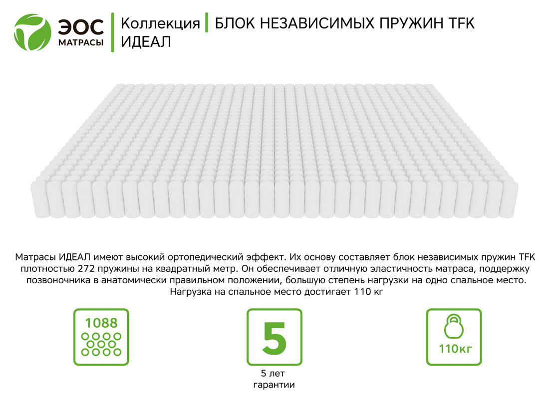 Созданные из экологически чистых и натуральных материалов матрасы коллекции «Идеал» имеют высокий ортопедический эффект и обладают высокими прочностными характеристиками. Их основу составляет блок независимых пружин TFK в котором каждая пружина блока находиться в отдельном тканевом чехле, что обеспечивает отличную эластичность матраса и поддержку позвоночника в анатомически правильном положении.