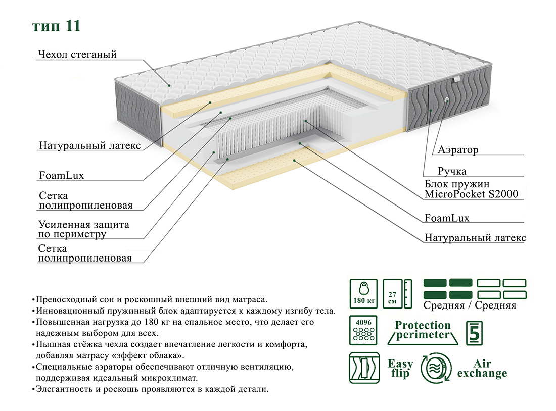 - Матрас оснащен инновационным пружинным блоком MicroPocket S2000 с 1024 пружинами на квадратный метр. Этот блок не только подстраивается под ваши контуры, но и реагирует на каждое движение, обеспечивая идеальную поддержку. С нагрузкой до 180 кг на спальное место.