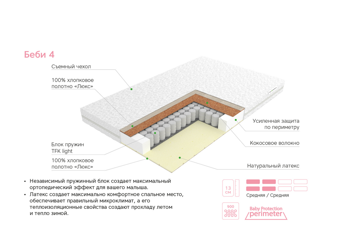 Детский матрас Беби-4 – двусторонний, несимметричный, премиум класса. Главная особенность этого детского матраса – блок независимых пружин, который обеспечивает максимальный ортопедический эффект. Каждая пружинка, облаченная в тканевый чехол, «подстраивается» под части тела спящего ребенка. Благодаря высокой точечной эластичности достигается правильное распределение нагрузки на позвоночник. Кокосовое волокно придает одной стороне матраса жесткость, необходимую во время сна малышам до годика. Натуральный латекс придают другой стороне матраса комфортность, обеспечивают поддержку позвоночнику, идеально повторяя изгибы тела ребенка после года жизни и обеспечивают ему спокойный сон.